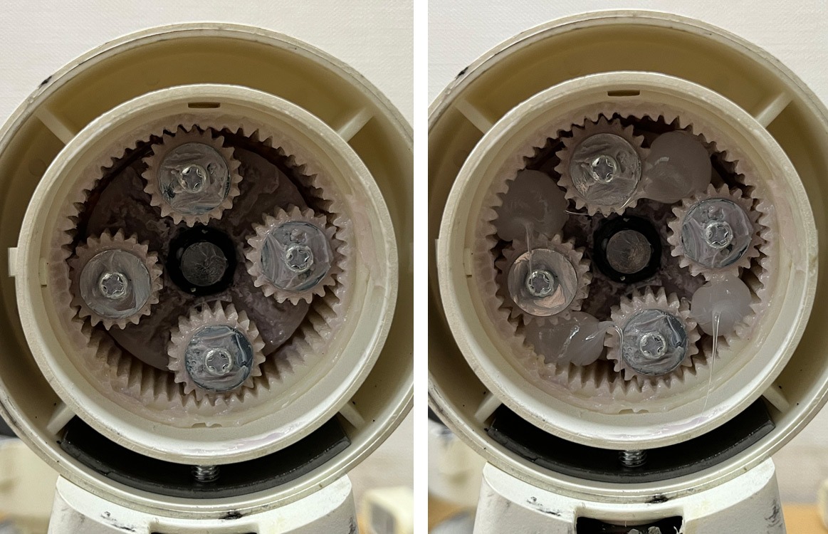 組みなおして動かしてみたところ少し音が大きかったため、樹脂を侵さないグリスを注入しておきます(左写真→右写真)。音の角が取れ、マイルドな作動音になりました。