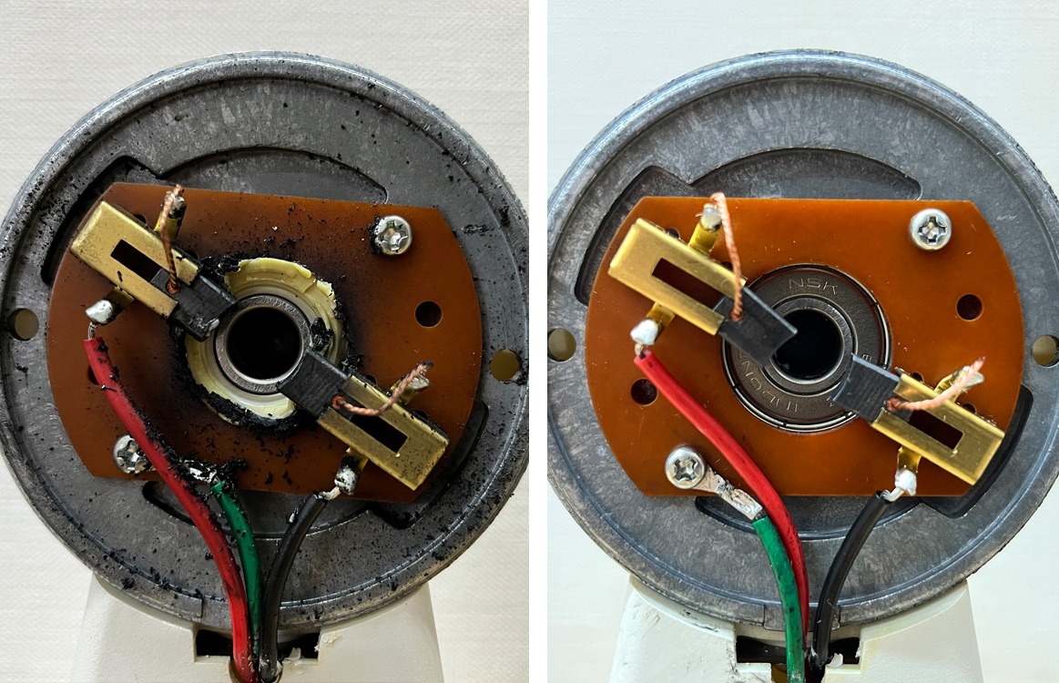 次にローター(コイル部分)のチェックを行いました。先ほどのカーボンの粉の汚れがこちらにも散見されたので、洗浄を行いました。(左写真→右写真)特に電気が流れる部分にグリス・カーボン汚れが多く付着しており、ショートの一因になったと考えられます。