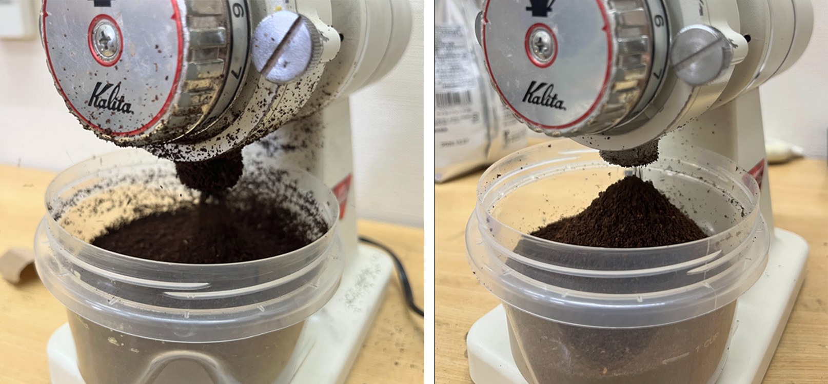 試し挽きを行ったところ、どうも粉の舞いがひどく静電気が多く発生しているようでしたので改善致しました(左写真→右写真)。