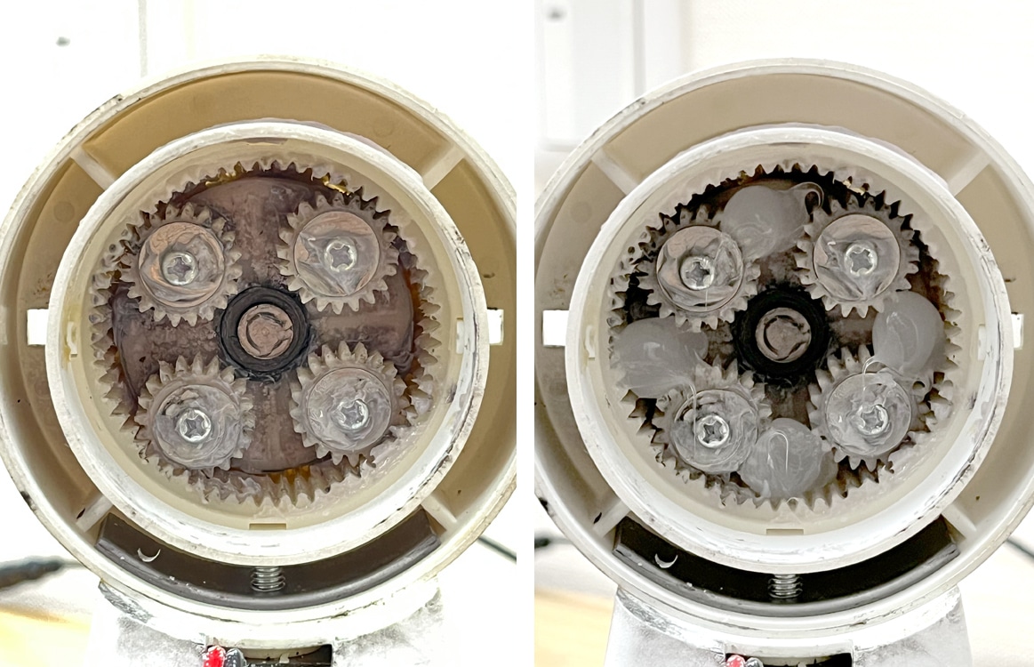 ギアボックス内のグリスがカラカラになっていたので、樹脂を侵さないグリスを注入しておきます(左写真→右写真)。