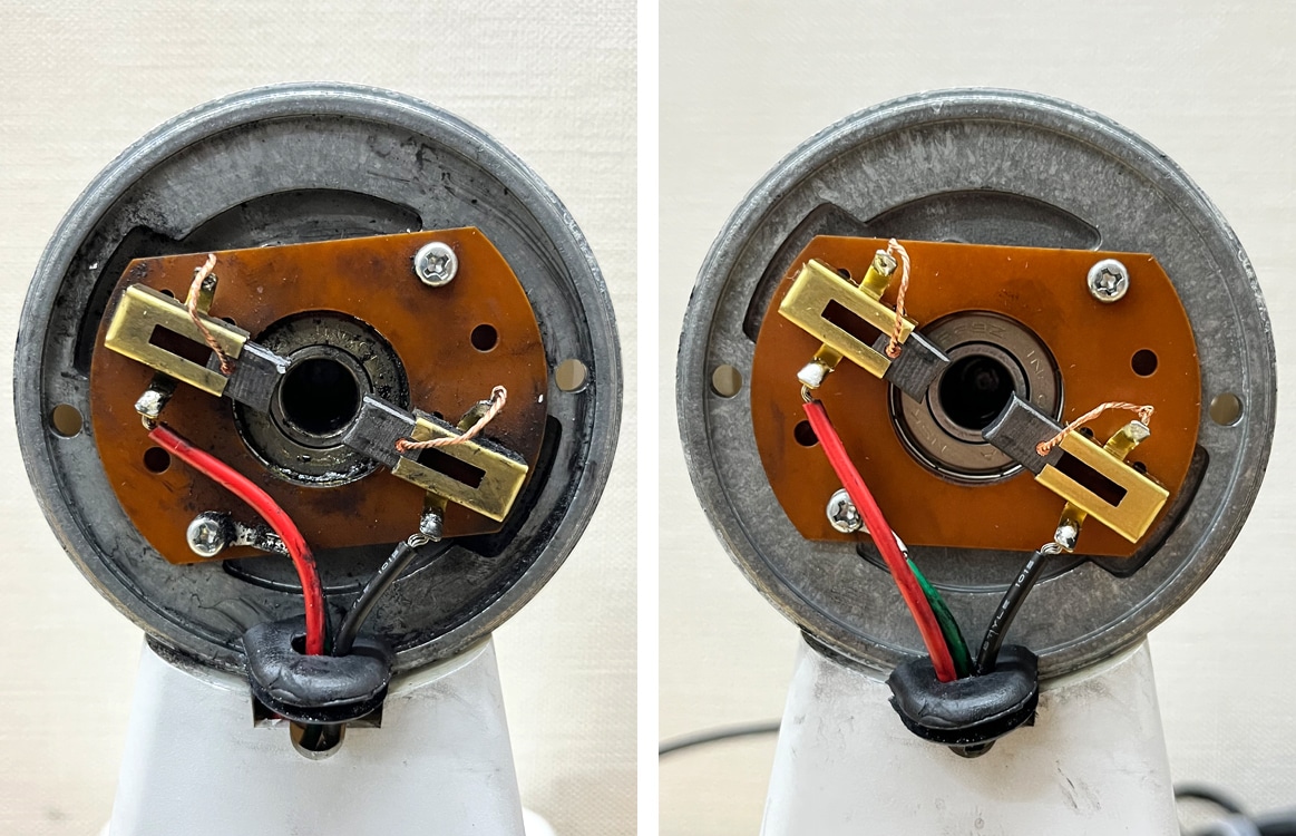 まずモーター部分を確認します。端子側に汚れが見られたので洗浄しました(左写真→右写真)。カーボンブラシの摩耗は現状交換するレベルではなく、これがヒューズ切れの直接的な原因ではありませんでした。