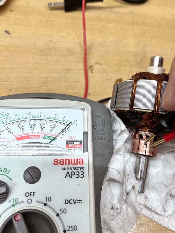 今回、コイル間にショートが確認されました。通常よりも2倍以上電気が流れやすくなっている部分3カ所あり、これがヒューズ切れの引き金になったようです。コイル間のショートも通常のレベルまで修理しました。(↓通常は5の目盛りの部分になります)
