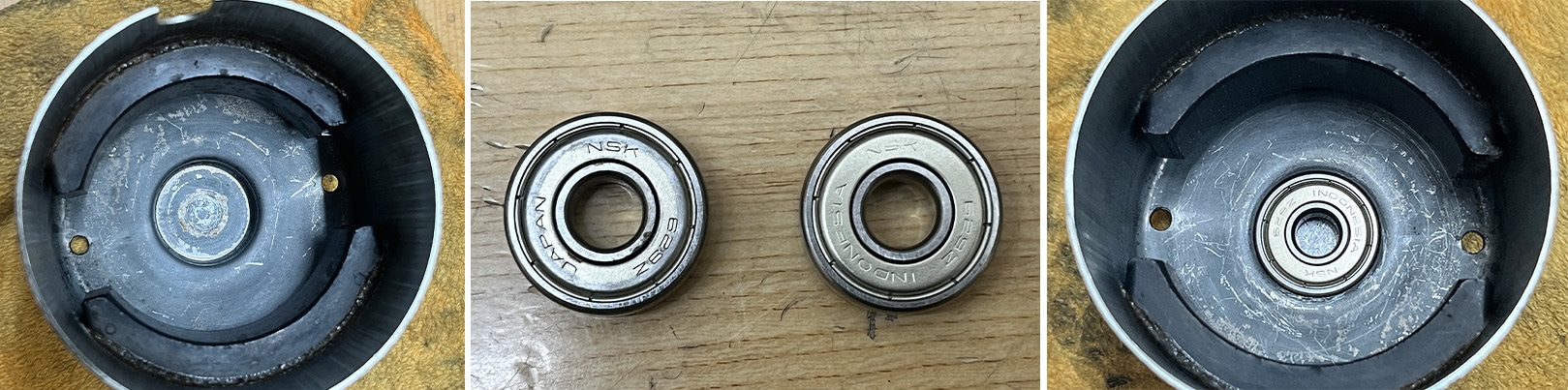 背面のベアリングを除去し(左写真)、ベアリングを交換します(中央写真 左から右)。そのベアリングをケースの穴に圧入して修理完了です(右写真)。組み立てて運転しますと滑らかな音となりました。
