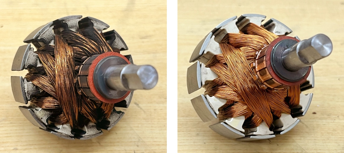 モーターのコイル部分にも多くのカーボン汚れが散見されましたので、汚れを除去しました(左写真)。コイル間に7カ所のショートも見られましたので元の抵抗値になるよう修理致しました。