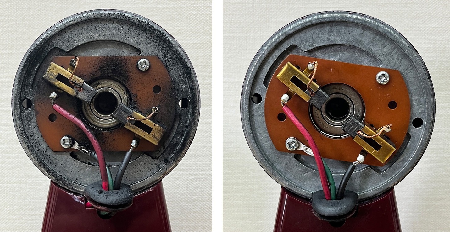 端子台は特に異常はありませんでした。使用に伴う汚れが付着していたため、徹底洗浄しました(左写真→右写真)。カーボンブラシの摩耗も現状交換するレベルではなく、これがヒューズ切れの直接的な原因ではありませんでした。