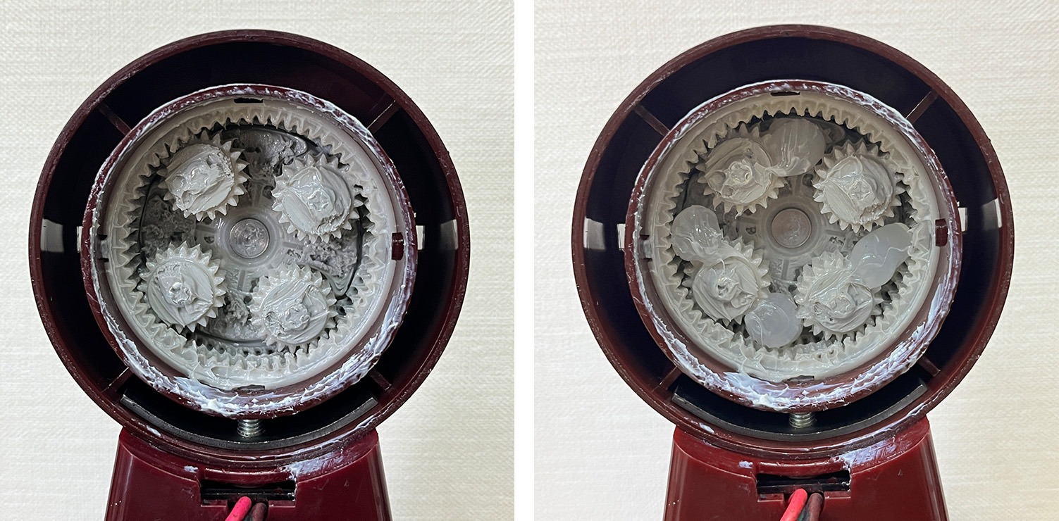 組みなおして動かしてみたところ少し音が大きかったため、樹脂を侵さないグリスを注入しておきます(左写真→右写真)。音の角が取れ、マイルドな作動音になりました。