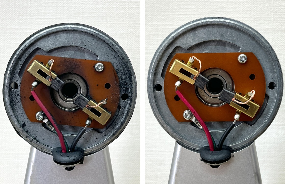 端子部分は想像よりも汚れは少ない印象ですが、そのままにしておくとヒューズ切れが再発するので綺麗にします(左→右)。消耗品のカーボンブラシは十分な量が確認でき、交換は不要です。