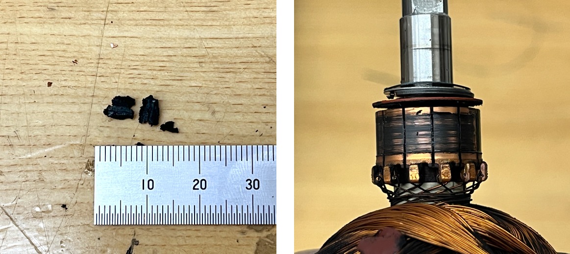 モーター内部にはフワフワしたものや固まったカーボン汚れが散見されました。また接点の隙間部分にもカーボン汚れが蓄積しており、長年の使用により徐々にショート箇所が拡大していったと考えられます。