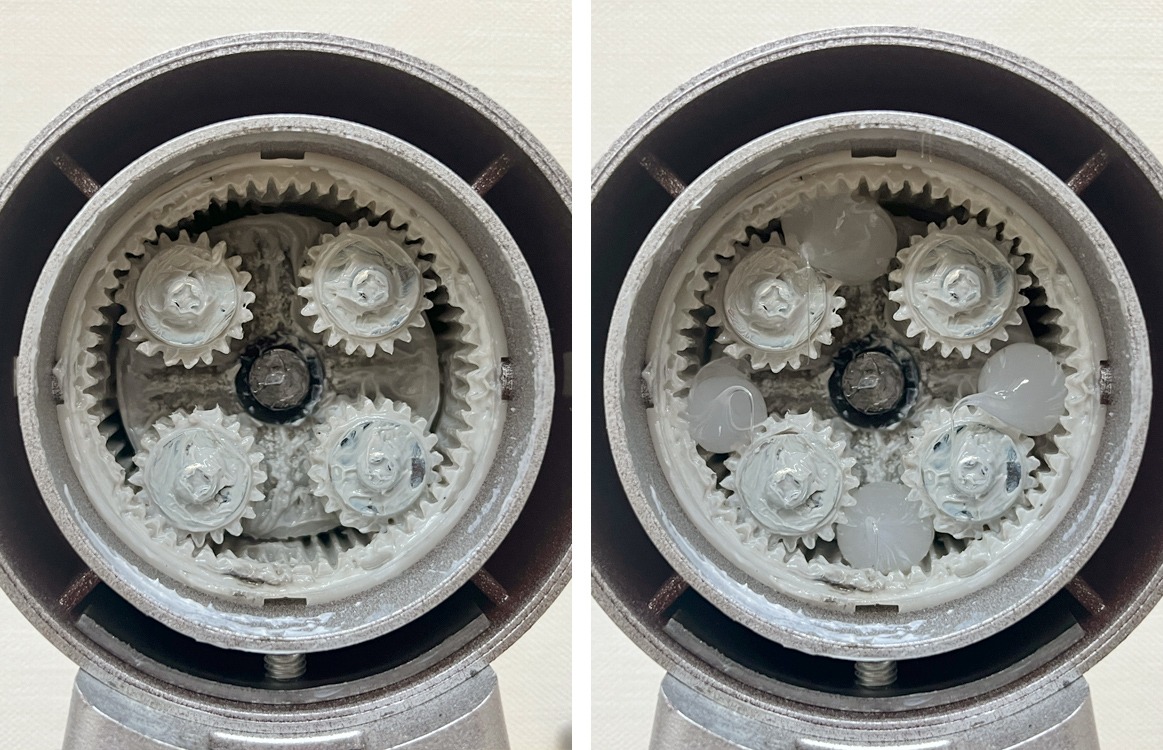モーターケース内にも汚れがありましたのでこちらも汚れを除去致しました(左→右)。