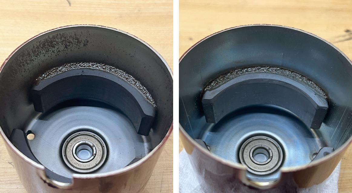 モーターケース内の周りにも汚れがありましたのでこちらも汚れを除去しました(左→右)。