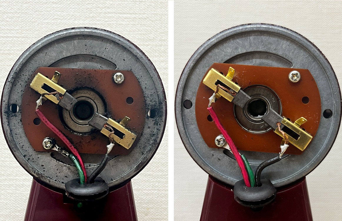 端子部分も汚れており、ヒューズ切れの再発原因になるので綺麗にします(左→右)。消耗品のカーボンブラシの摩耗は少ないためそのままです。