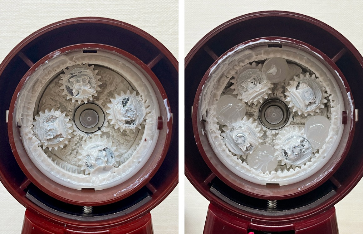 動作音が大きく、ギアボックス内を確認しました。ギア部分のグリスが少なくなっています。グリスを追加したところ、音が小さく滑らかになりました。