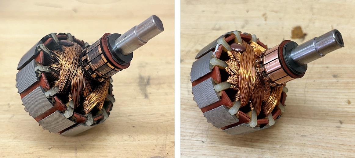 モーター内部にカーボンブラシの汚れの塊が多く溜まっています。コイルの端子間も汚れており、コイル間でショートが見られました。こちらが今回の故障の原因のようで、修理の方を行いました。
