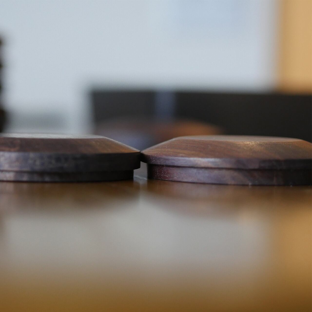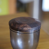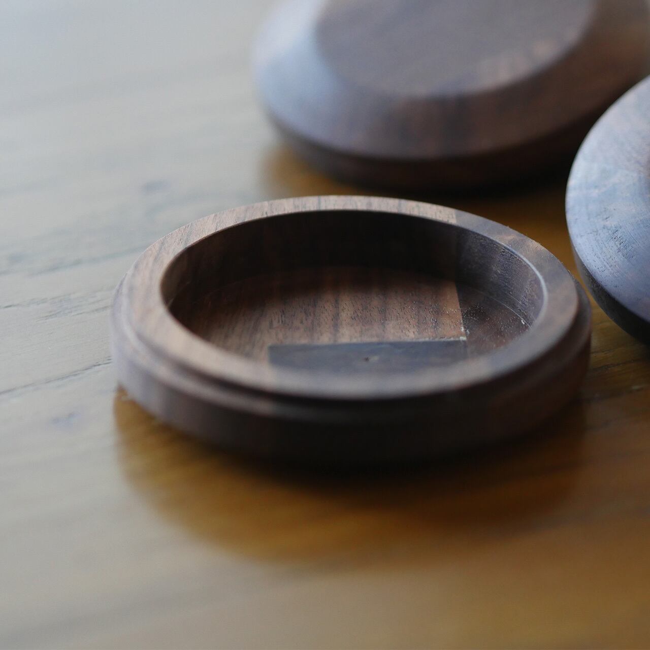 今回、ウォールナットの1枚板から集成材に変更致しました。集成材は規格外の材も有効活用して生産されるため環境に優しい木材です。一つ一つ、表情が異なるフタになります。